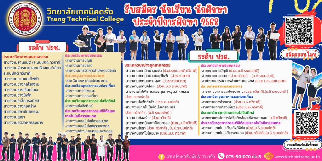 รายการแข่งขันทักษะวิชาชีพ 2568 ร่างเกณฑ์ กติกา การแข่งขันทักษะวิชาชีพ 2568 ข่าวประชาสัมพันธ์ พิธีปิดงานประชุมวิชาการองค์การนักวิชาชีพในอนาคตแห่งประเทศไทย (อวท.) ระดับจังหวัดตรัง ครั้งที่ 10 ประจำปีการศึกษา 2568 Posted on12/ธ.ค./ 202512/ธ.ค./ 2025 ข่าวประชาสัมพันธ์ การประเมินองค์การนักวิชาชีพในอนาคตแห่งประเทศไทยและการประเมินสมาชิกดีเด่นภายใต้การนิเทศ ปีการศึกษา 2568 Posted on09/ธ.ค./ 202509/ธ.ค./ 2025 ข่าวประชาสัมพันธ์ การประกวดแข่งขันสิ่งประดิษฐ์ของคนรุ่นใหม่ กลุ่มจังหวัดกระบี่ ตรัง ประจำปีการศึกษา 2568 Posted on02/ธ.ค./ 202503/ธ.ค./ 2025 ข่าวประชาสัมพันธ์ โครงการศูนย์ซ่อมสร้างเพื่อชุมชน (Fix it -จิตอาสา) ช่วยเหลือผู้ประสบภัยภาคใต้ Posted on02/ธ.ค./ 202503/ธ.ค./ 2025 ข่าวประชาสัมพันธ์ วิทยาลัยเทคนิคตรังทำโรงครัวประกอบอาหารพร้อมเดินทางมอบถุงยังชีพ และเยี่ยมบ้านคณะครู นักเรียน นักศึกษาครอบครัวที่ได้รับผล กระทบจากสถานการณ์น้ำท่วม Posted on27/พ.ย./ 202528/พ.ย./ 2025 ข่าวประชาสัมพันธ์ ดร.กษิดิฏฐ์ คำศรี ผู้อำนวยการวิทยาลัยเทคนิคตรัง พร้อมด้วยคณะครู และบุคลากรทางการศึกษา ร่วมแรงร่วมใจจัดเตรียมถุงยังชีพ เครื่องอุปโภคบริโภคไปเยี่ยมบ้านนักเรียน นักศึกษา ที่ได้รับผลกระทบจากสถานการณ์น้ำท่วม Posted on24/พ.ย./ 202525/พ.ย./ 2025 อ่านข่าวประชาสัมพันธ์ทั้งหมด ข่าวสำหรับนักเรียน นักศึกษา ประกาศวิทยาลัยเทคนิคตรัง เรื่อง ปิดเรียนด้วยเหตุพิเศษเนื่องจากสถานการณ์น้ำท่วม (ฉบับที่ 2) Posted on25/พ.ย./ 202525/พ.ย./ 2025 ข่าวสำหรับนักเรียน นักศึกษา ประกาศวิทยาลัยเทคนิคตรัง เรื่อง ปิดเรียนด้วยเหตุพิเศษเนื่องจากสถานการณ์น้ำท่วม Posted on23/พ.ย./ 202523/พ.ย./ 2025 ข่าวสำหรับนักเรียน นักศึกษา ส่งประกาศ (แบบ สด.39) ให้ไปแสดงตนเพื่อรับหมายเรียก Posted on11/พ.ย./ 202511/พ.ย./ 2025 ข่าวสำหรับนักเรียน นักศึกษา วิทยาลัยเทคนิคตรังขอแสดงความยินดี กับนักเรียนที่ได้รับการคัดเลือก เป็นนักกีฬาเปตองเยาวชน ตัวแทนของ จังหวัดตรัง Posted on03/พ.ย./ 202503/พ.ย./ 2025 ข่าวสำหรับนักเรียน นักศึกษา โครงการจัดทำแผนงบประมาณองค์การนักวิชาชีพในอนาคตแห่งประเทศไทย วิทยาลัยเทคนิคตรัง ประจำปีงบประมาณ พ.ศ.2569 Posted on02/พ.ย./ 202503/พ.ย./ 2025 ข่าวสำหรับนักเรียน นักศึกษา การปฐมนิเทศนักเรียน นักศึกษา ก่อนออกฝึกงาน ภาคเรียนที่ 2 ปีการศึกษา 2568 Posted on09/ต.ค./ 202513/ต.ค./ 2025 อ่านข่าวสำหรับนักเรียน นักศึกษาทั้งหมด ข่าวจัดซื้อ/จัดจ้าง ประกาศวิทยาลัยเทคนิคตรัง เรื่อง ประกวดราคาจ้างก่อสร้างห้องน้ำห้องส้วมชายและหญิงด้วยวิธีประกวดราคาอิเล็กทรอนิกส์ (e-bidding) Posted on15/ธ.ค./ 202515/ธ.ค./ 2025 เอกสารประกวดราคา แบบ [… ... ข่าวจัดซื้อ/จัดจ้าง ประกาศวิทยาลัยเทคนิคตรัง เรื่อง ประกวดราคาซื้อชุปฏิบัติการวิศวกรรมสำร
