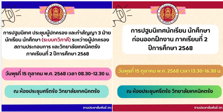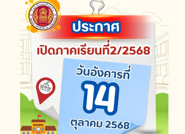 ข่าวสำหรับนักเรียน นักศึกษากำหนดการเปิดภาคเรียนที่ 2 /2568 ระดับชั้น ปวช. ปวส. และ ทล.บ. วิทยาลัยเทคนิคตรัง งานศูนย์ข้อมูลสารสนเทศ / 06/ต.ค./ 2025