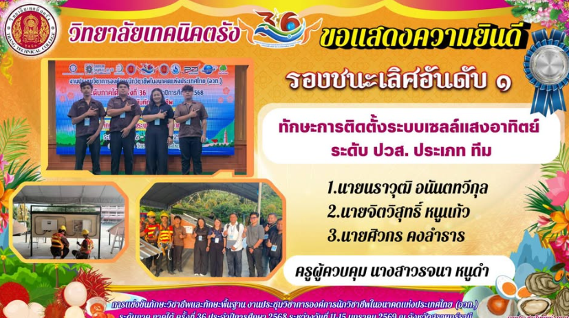 ข่าวประชาสัมพันธ์วิทยาลัยเทคนิคตรัง ขอแสดงความยินดี นักเรียน นักศึกษาและครูผู้ควบคุมได้รับรางวัลรองชนะเลิศอันดับ 1การแข่งขันทักษะการติดตั้งระบบเซลล์แสงอาทิตย์ งานศูนย์ข้อมูลสารสนเทศ / 16/ม.ค./ 2026