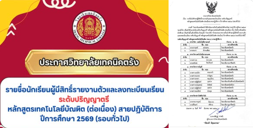 ข่าวสำหรับนักเรียน นักศึกษาวิทยาลัยเทคนิคตรัง ประกาศรายชื่อนักศึกษาผู้มีสิทธิ์รายงานตัวและลงทะเบียนเรียน ระดับปริญญาตรี หลักสูตรเทคโนโลยีบัณฑิต (ต่อเนื่อง) สายปฏิบัติการ ปีการศึกษา 2569 (รอบทั่วไป) งานศูนย์ข้อมูลสารสนเทศ / 24/มี.ค./ 2026