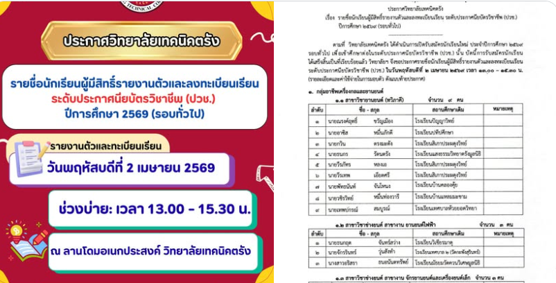 ข่าวสำหรับนักเรียน นักศึกษาวิทยาลัยเทคนิคตรัง ประกาศรายชื่อนักศึกษาผู้มีสิทธิ์รายงานตัวและลงทะเบียนเรียน ระดับประกาศนียบัตรวิชาชีพชั้นสูง (ปวส.) ปีการศึกษา 2569 (รอบทั่วไป) งานศูนย์ข้อมูลสารสนเทศ / 24/มี.ค./ 2026