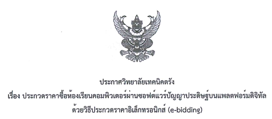 ข่าวจัดซื้อ/จัดจ้างประกาศวิทยาลัยเทคนิคตรัง เรื่อง ประกวดราคาซื้อห้องเรียนคอมพิวเตอร์ผ่านซอฟต์แวร์ปัญญาประดิษฐ์บนแพลตฟอร์มดิจิทัลด้วยวิธีประกวดราคาอิเล็กทรอนิกส์ (e-bidding) งานศูนย์ข้อมูลสารสนเทศ / 23/ม.ค./ 2026 เอกสารประกวดราคา คุณ