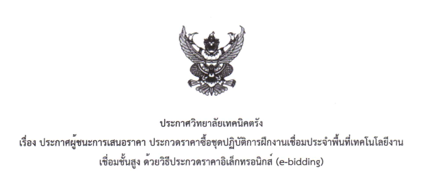 ข่าวจัดซื้อ/จัดจ้างประกาศวิทยาลัยเทคนิคตรัง เรื่อง ประกาศผู้ชนะการเสนอราคา ประกวดราคาซื้อชุดปฏิบัติการฝึกงานเชื่อมประจำพื้นที่เทคโนโลยีงานเชื่อมชั้นสูง ด้วยวิธีประกวดราคาอิเล็กทรอนิกส์ (e-bidding) งานศูนย์ข้อมูลสารสนเทศ / 28/ม.ค./ 2026